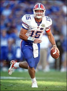 He was named Player of the Year as a junior (playing his last game that season with a broken fibula), and named Mr. Football his senior year after he lead Nease to the Class 4A title. On December 13, 2005, three days after Nease won state, Tim announced he would be playing for his parents’ alma mater, the University of Florida. Also a second documentary followed him from his last college game to being selected by the Denver Broncos with the 25th pick in the first round (It was entitled Tim Tebow: Everything in Between.)