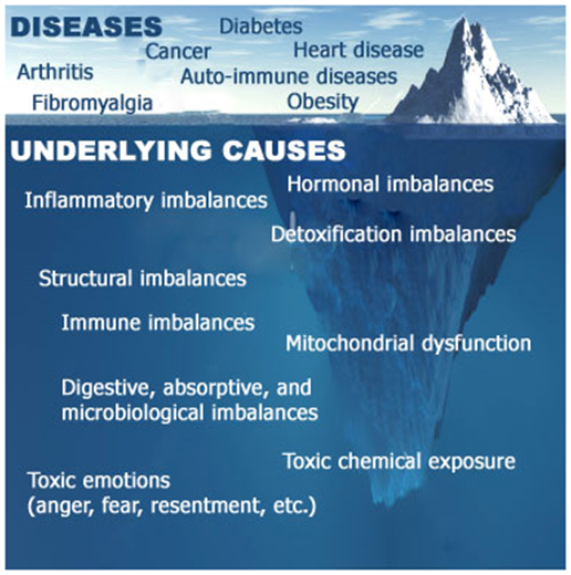 As the graphic above shows, specific diseases such as arthritis, diabetes and fibromyalgia may be visible above the surface but the underlying cause is the altered physiology below the surface. The underlying imbalances, dysfunctions, exposures, stress load are the real causes of a person’s health issues.