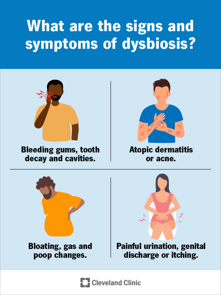 Dysbiosis may cause different symptoms in your gut, mouth, genitals or skin