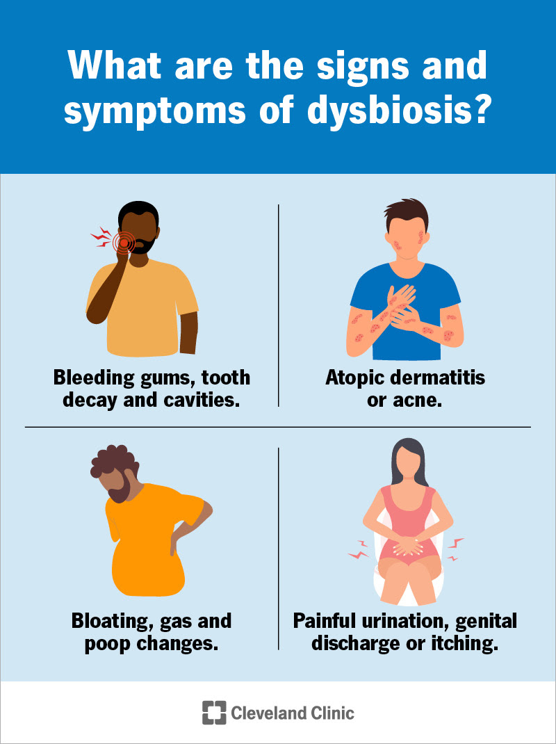 You might have dysbiosis in your mouth, on your skin, in your intestine or in your urinary system if you have signs or symptoms of a bacterial, viral or fungal infection or overgrowth there. These might include: