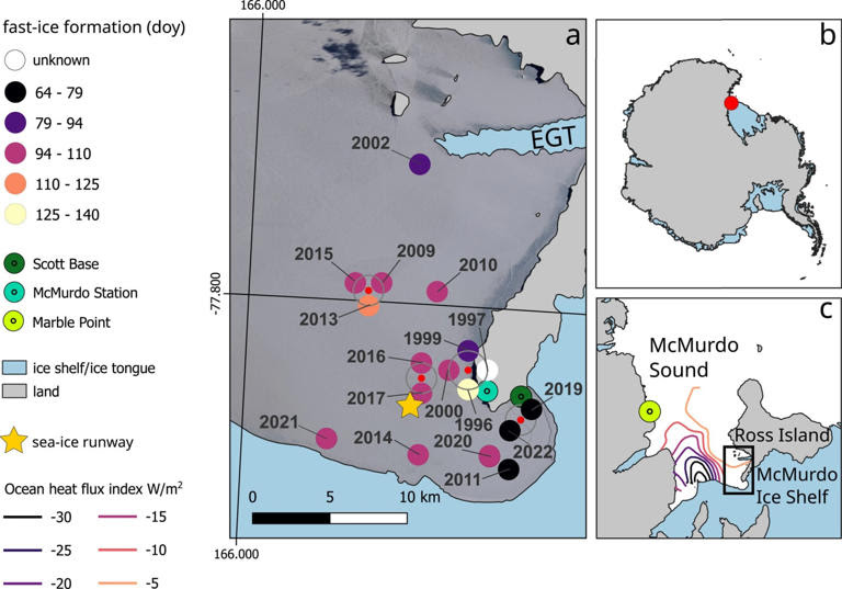 (a) Map of McMurdo Sound with position in Antarctica (b), and relative to Ross Island (c). (CREDIT: U.S. Geological Survey) © The Brighter Side of News