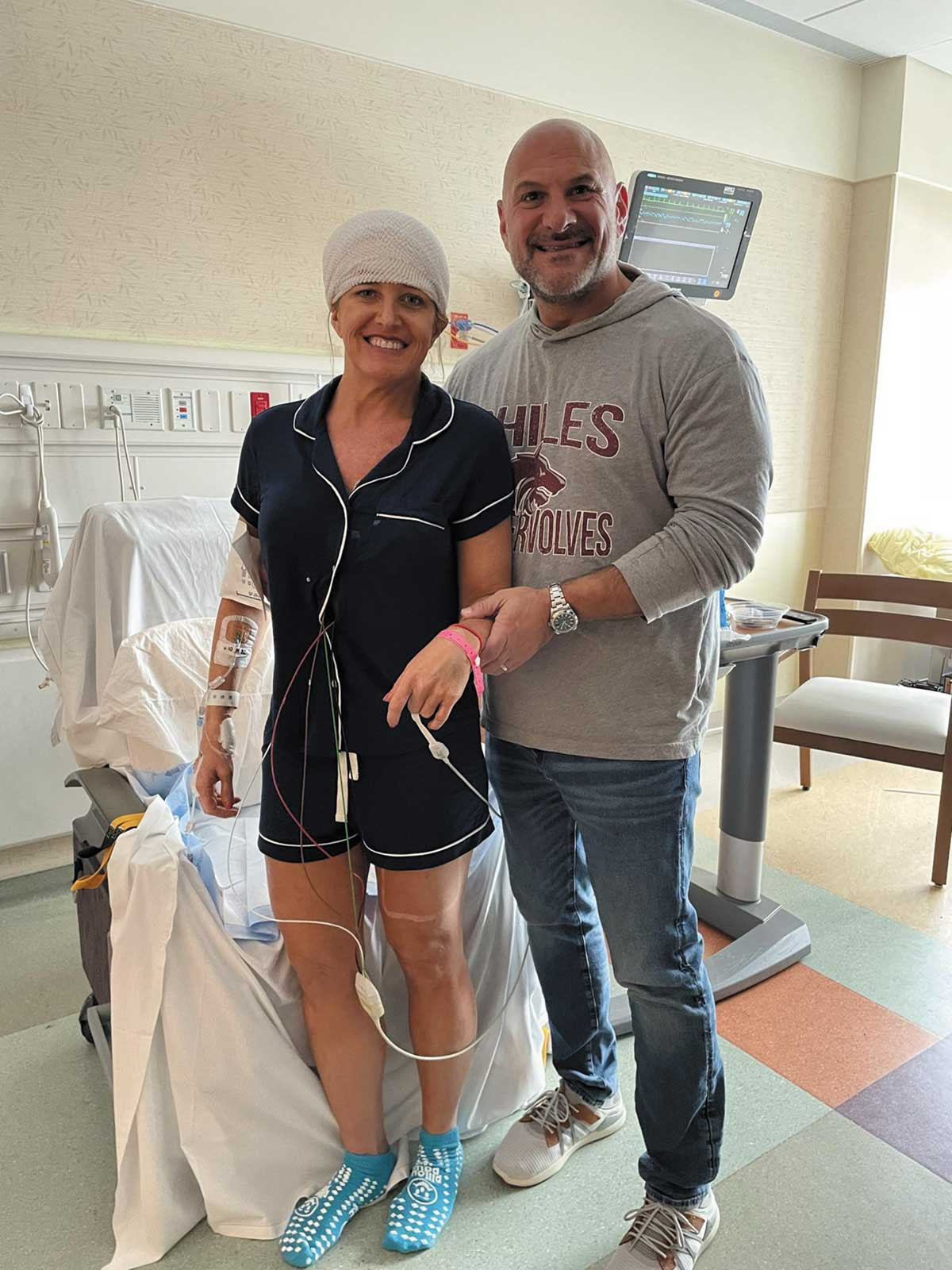 I have never stopped working out, even when going through chemo, with no hair, and even after a craniotomy. I am in the gym six days a week. My family is a huge support, but especially my husband Dan who is there every single moment to help me get through the horrible, scary moments that I frequently have.