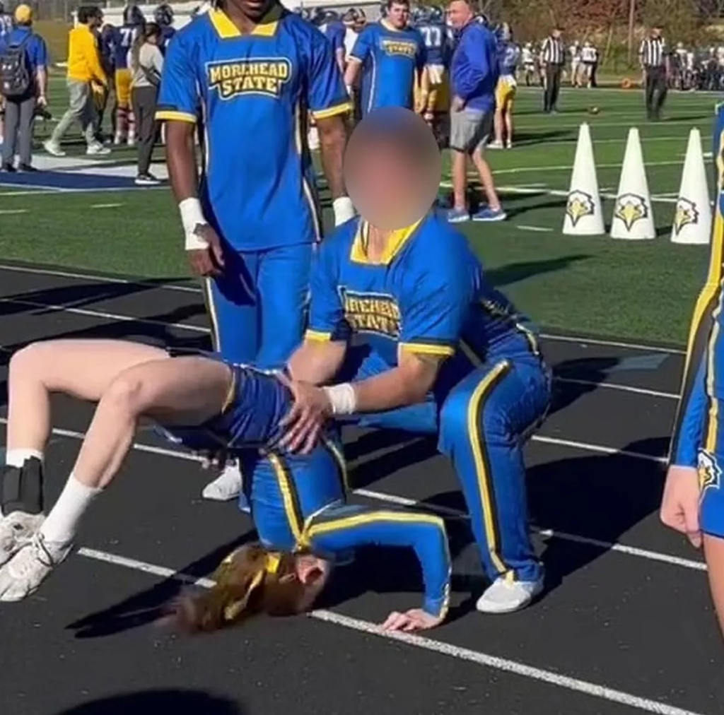 Corey Martens, 29, had stepped in at the last minute to perform in the halftime show during the American football game for Morehead State University when the stomach-turning incident happened November 2, 2024. The video shows her teammate perfectly executing the ‘back handspring up’ seconds before she makes her own attempt.
